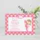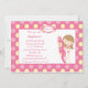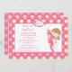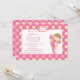 Cet invitation de fête d'anniversaire de filles a un arrière - plan rose et jaune de à petits pois. Il y a une fille dans un bikini tenant une planche de surf, à côté de l'information personnalisable de partie. Ceci fonctionnerait grand pour la partie tropicale de natation ! Studio de cacao