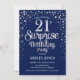 Invitation à la fête du 21e anniversaire Surprise. Design élégant en bleu marine et faux parties scintillant argent. Comprend des polices de caractères et des confettis stylisés. Message-moi si vous avez besoin d'âge personnalisé.