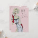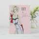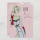 Une femme blonde à l'aquarelle peinte à la main épingle modèle portant une jupe noire et blanche moulante et dessus avec de longs gants de soirée rouges brandissant un martini sur un style vintage inspiré Cinquante et Fabuleux - 50e Invitation de fête d'anniversaire surprise en rose rose poussiéreux. Cette invitation est sexy, classe et prête à vous faire personnaliser !