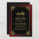 Invitation de 90e anniversaire Black surprise avec un cadre doré orné avec une bordure extérieure à l'ombre rouge pour compléter le design créant une invitation dynamique pour votre occasion spéciale.