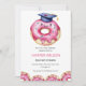 A sweet and playful donut-themed graduation party invitation featuring a pink watercolor design and a charming blue graduation cap.