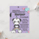 Célébrez une fête magique avec cette adorable licorne Panda au sommet d'un arc-en-ciel. L'arrière - plan est un joli violet clair, aux accents floraux rose et bleu. Personnalisez les détails de votre parti. Idéal pour les amateurs de panda.