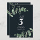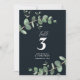 Conception élégante et délicate de numéro de table de mariage avec feuillage d'eucalyptus économique. Collection rustique contemporaine élégante et moderne dans les tons de vert sauge, noir, bleu marine et blanc. Idéal pour les mariages de printemps, d'été, d'automne ou d'hiver.