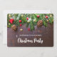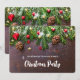 Une invitation à une fête de Noël avec une photographie rustique d'une table en bois marron avec des pommes de pin, des aiguilles de pin, de la neige et des décorations de Noël. Festif et charmant.