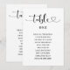 Aidez vos invités à trouver leur place avec cette carte de tableau de disposition à l'écriture moderne cœur. Chaque carte présente la calligraphie fluide "Table" avec un accent de cœur, un nom de table écrit en toutes lettres et une liste d'invités soigneusement organisée en dessous. Affichez les cartes ensemble sur une corde à linge, un panneau ou un cadre pour une réception charmante. Entièrement personnalisable avec les noms de vos invités et les affectations de table.