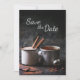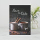 Cette annonce de mariage Save the Date présente un cadre rustique avec une tasse de thé et de chocolat chaud en amour.