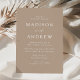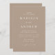 Faire-part de mariage minimaliste et moderne avec vos détails mariages en lettres blanches avec accents de script de calligraphie. L'arrière - plan taupe peut être changé en une couleur de votre choix. Conçu pour coordonner avec notre collection de mariages Modern Elegance.