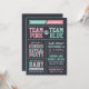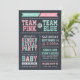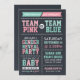 Des amis Invitations et la famille pour savoir si votre nouveau bébé est un garçon ou une fille avec ce mignon bébé moderne sexe révèlent l'invitation de la fête. Le design présente un thème sportif Team Pink ou Team Blue avec un amusant mélange audacieux de typographie dans les tons blanc, rose et bleu sur un faux arrière - plan de texture de tableau noir imprimé. Cliquez sur le bouton Customiser pour modifier les polices, les couleurs et déplacer du texte pour créer votre propre modèle unique d'invitation.