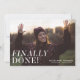 Invités Invitations à votre fête avec nos invitations de la fête de remise des diplômes de Fini Terminé. Les invitations de la fête de remise de diplômes amusants présentent "Enfin fait !" dans une police blanche moderne superposée avec la photo, le nom, l'école et l'année de remise de diplômes du diplômé sur le devant de la scène. Le dos montre "fêtons" et les détails de votre fête en blanc contre un arrière - plan noir.