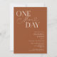 Dîner de répétition minimaliste mariage avec un texte de typographie qui dit "un jour de plus". L'arrière - plan est en terre cuite.