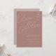Une belle faire-part de mariage typographique avec vos noms dans des lettres de script surdimensionnées en haut, en ton sur les tons pour un effet filigrane. Personnalisez avec vos détails de mariage dans les lettres serif classiques alignées en bas à droite. Notre colorway en terre cuite est un élégant mélange de neutrales terreux, avec des lettres chaudes blanches et taupes roses sur un arrière - plan en terre cuite.
