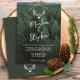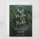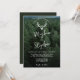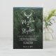 Une conception d'invitation de mariage rustique avec un fond de photo de forêt panoramique par Destei avec des bois de cerf et une petite silhouette de cœur pour un effet inspiré des bois. Le devant comprend un texte incurvé invitant les invités au mariage, un espace pour les noms, les détails de l'événement et les informations sur la réception. Le dos a un fond vert foncé avec des zones pour les initiales et la date du mariage. Un choix magnifique pour les amoureux de la nature, les cérémonies en plein air, les mariages en forêt et les couples qui prévoient une célébration sur le thème de la randonnée ou de l'aventure.