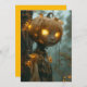 L'image représente une illustration étrangement belle d'une silhouette avec une tête de citrouille. La citrouille est détaillée de manière complexe, avec des yeux brillants qui émettent une lumière chaude et dorée. De délicats brins de vignes et de fils sont enroulés autour de la citrouille et du cou de la silhouette, ajoutant un effet inquiétant mais envoûtant. La silhouette est vêtue d'une tenue terreuse et déchirée qui se fond parfaitement dans l'environnement automnal. L'arrière-plan présente une forêt brumeuse avec des lumières doucement brillantes et des feuilles qui tombent, créant une atmosphère mystérieuse et magique.
