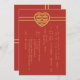Lignes épurées modernes et contemporaines avec des éléments de mariage traditionnels chinois, cette invitation de mariage est idéale pour les couples chinois qui se marient ! Le caractère chinois signifiant double bonheur, utilisé pour le bonheur conjugal, est intégré dans une forme de cœur. Le texte jaune doré faux contraste joliment avec le fond rouge. Personnalisez facilement avec vos détails de mariage en texte chinois !