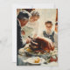 Cette image représente une scène Thanksgiving classique évoquant des illustrations vintages. Il dispose d'une famille réunie autour d'une table à manger, regardant joyeusement un homme plus âgé sculpter une grande dinde dorée rôtie. La lumière chaude qui s'écoule à travers la fenêtre éclaire les visages des membres de la famille, soulignant leur bonheur et leur anticipation. La table est élégamment dressée avec un festin copieux, comprenant des raisins et des garnitures décoratives entourant la dinde. L'atmosphère générale évoque un sentiment de nostalgie, de chaleur et de célébration.