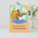 Le texte de cette invitation de Thanksgiving disait : "Vous êtes invité à une fête de Thanksgiving". Une image d'une dinde caricaturale en tablier et d'un casquette de chef portant une tarte est représentée à l'avant comme à l'arrière. avec un lieu pour la date, l'heure et le lieu sur le dos