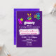 Une invitation d'anniversaire totalement géniale. Décoré d'éléments psychédéliques funky. Un signe de paix fait à la main aux couleurs de l'arc-en-ciel. Fleurs et signes de paix circulaires de style années soixante. Sur fond violet. Un design coloré et cool.