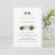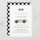 Invitation de fête d'anniversaire sur le thème de la voiture de course rétro. Illustration de voiture de course vert sauge et motif à carreaux en arrière-plan.