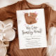 Baby shower thème ours en peluche avec une illustration peinte à la main d'un ourson avec un nœud rose et des cœurs. Le texte dit "on peut à peine attendre !". Cette invitation est idéale pour une baby shower de fille.