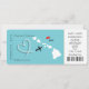 Une invitation de mariage amusante mais élégante à destination dans un style carte d'embarquement/billet pour les couples se mariant à l'étranger à Hawaï qui est montré dans une silhouette carte blanche sur le bleu turquoise avec coeur d'amour rouge sucré, silhouette d'avion et forme de coeur tourbillonnant blanc. Le verso de la carte d'embarquement est facile à customiser avec vos coordonnées de mariage personnel et la photo