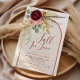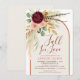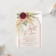 Célébrez la mariée d'être avec cette invitation à la douche nuptiale automne dans l'amour, avec un élégant bouquet de fleurs de chrysanthèmes rouges bordeaux, roses roses rousses, la verdure d'eucalyptus, plumes de faisan, feuillage d'herbe pampas séchée, feuilles d'automne dorées et plus encore. Le design est posé sur un arrière - plan blanc et encadré par une arche gracieuse mais moderne dans une chaleureuse couleur terre cuite orangée et beige tourbe d'avoine douce pour une atmosphère naturelle et terreuse. Avec son style boho rustique moderne, cette invitation donne le ton parfait pour une fête d'automne. Associez-vous à des panneaux de coordination, des cartes de remerciement, des jeux, des faveurs et de la décoration de la suite événementielle Fall in Love pour une douche nuptiale cohésive cet automne.