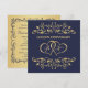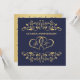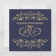 Carton d'invitation pour 50 ans de mariage avec des tourbillons dorés et des cœurs unis sur fond bleu foncé. Vous pouvez ajuster le texte selon vos besoins.