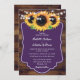 Faire-part de mariage rustique violet de campagne avec des tournesols contre un arrière - plan en bois de grange orné de lampes à cordes. Conception de carte parfaite pour votre mariage rustique violet, jardin, jardin ou grange inspiré des tournesols.