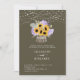 Un pot de fleurs, fait d'écorce d'arbre et rempli d'un bouquet luxuriant de tournesols, lavande, blé et haleine de bébé, ainsi que des hydrangées, fait une belle illustration, peinte à la main dans l'aquarelle numérique, qui orne cette élégante invitation de mariage rustique qui comporte également un arrière - plan rustique en or et des cordes de lumières. Romantique et charmant, il est un choix agréable pour un mariage de grange, un mariage extérieur, un mariage de jardin ou tout cadre rustique.