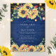 Ces invitations de mariage à l'aquarelle de tournesol de tournesol avec des feuilles d'eucalyptus, des feuilles d'automne, des jarres de maçon et des lampes à cordes sur un arrière - plan en bois bleu marine. Personnalisez-les avec votre texte. Produits correspondants disponibles.