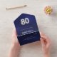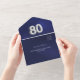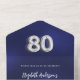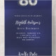 Un arrière - plan bleu marine. La couleur bleue est inégale. Personnalisez et ajoutez le nom, les détails du parti, la date RSVP, l'adresse et le nom de retour. Le numéro 80 est écrit avec une police de style ballon en faux argent.