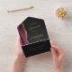 Le bord gauche de cette élégante faire-part de mariage tout-en-un moderne et RSVP est doté d'une bordure d'aquarelle rouge bordeaux et ornée d'une parties scintillant en faux or. Le texte personnalisable combine un script de calligraphie de couleur or et des polices sans serif sur un arrière - plan noir en ardoise. L'adresse de retour apparaît sur le rabat extérieur et sur le côté arrière de la carte RSVP détachable en texte doré sur ardoise solide noir.
