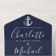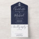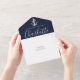 Un faire-part de mariage tout-en-un avec une ancre et un élégant nom de script signature et des initiales monographiques sur un arrière - plan bleu marine. L'invitation comprend une carte RSVP perforée qui peut être adressée individuellement ou laissée vide pour que vous puissiez écrire à la main les coordonnées de votre invité. Conçu par Thisisnotme©