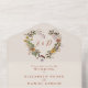 Faire-part de mariage tout-en-un avec vos initiales monogrammes dans une jolie guirlande à coeur fleurie et vos détails dans une typographie élégante. L'invitation comprend une carte RSVP perforée avec votre code QR du site Web mariage et des détails. Conçu par Thisisnotme©