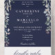 Le tout dans un faire-part de mariage avec une belle cascade de verdure fleurie, de jolies lampes à cordes, une typographie élégante et des initiales monogrammes sur un arrière - plan bleu marine. L'invitation comprend une carte RSVP perforée avec votre code QR du site Web mariage et des détails. Conçu par Thisisnotme©