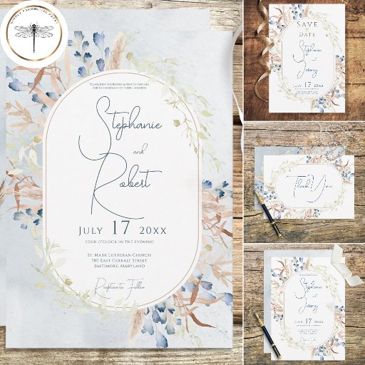 Invitation Tout En Un Bleu & Tan Séché Boho Fleurs Bleu QR Code