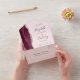 The left-hand edge of this elegant modern all-in-one wedding invitation and RSVP features a burgundy watercolor agate border trimmed with faux silver glitter. The customizable text combines charcoal gray handwriting script with copperplate and italic fonts on a blush pink background. The return address appears on the outside flap and the reverse side of the detachable RSVP card.