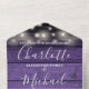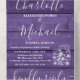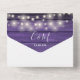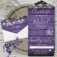 Le tout dans un faire-part de mariage avec de jolies lampes à cordes, des jarres de maçon, des noms de style signature et une typographie chic sur un arrière - plan rustique en bois violet. L'invitation comprend une carte perforée RSVP avec choix de repas. Conçu par Thisisnotme©