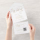 Cet élégant mariage d'or code QR de charme tout en une invitation est parfait pour un mariage simple. Le design minimaliste moderne présente une calligraphie romantique blanche et dorée au style de conte de fées bohème. Inclure un code QR pour vos invités à RSVP en ligne. Écrivez vos adresses d'invités à l'arrière de l'invitation pliée, ou achetez des autocollants de étiquette de adresse d'invités de coordination (vendus séparément).