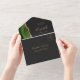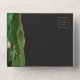 Le bord gauche de cette élégante faire-part de mariage tout-en-un moderne et RSVP est doté d'une bordure d'aquarelle vert chasseur, ornée d'une parties scintillant en faux or. Le texte personnalisable combine écriture manuscrite couleur or, cuivre et polices italiques sur un arrière - plan non noir. L'adresse de retour apparaît sur le rabat extérieur et sur le côté arrière de la carte RSVP détachable en texte doré sur un solide non noir.