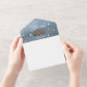 thème baby shower avec illustrations d'un bébé ours reposant sur une branche d'arbre, des montagnes, des arbres, des étoiles et un arrière - plan d'aquarelle bleue. Retirer la demande de réservation "livres pour bébé" carte attachée au fond.