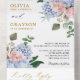 Mariage moderne tout en une invitation avec hydrangées bleu clair / bleu poussiéreux avec rose pastel, rougit, pêche, roses blanches, pivoines, feuilles d'eucalyptus sauge, branches et feuillage. Des teintes douces et romantiques oniriques et muettes ressortent des motifs floraux d'aquarelle d'été pour s'adapter à votre mariage thématique.