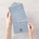 Le tout dans une seule faire-part de mariage avec de jolies lampes à cordes, des noms de style signature et une typographie chic sur un arrière - plan bleu poussiéreux. L'invitation comprend une carte RSVP perforée avec un code QR. Conçu par Thisisnotme©