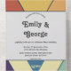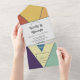Cette faire-part de mariage moderne est parfaite pour le couple qui veut faire une déclaration élégante. L'invitation présente une calligraphie rétro audacieuse sur un rectangle blanc avec un arrière - plan géométrique abstrait vibrant et super. La combinaison artistique de l'ancien et du nouveau donne à tout événement une touche unique et accueillante. Que vous planifiez un simple rassemblement ou une grande fête, cette invitation fera en sorte que vos invités sachent que c’est une occasion de se souvenir.