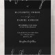 Faire-part de mariage tout-en-un avec une typographie élégante sur fond noir. L'invitation comprend une carte RSVP perforée avec un code QR. Conçu par Thisisnotme©