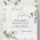 Design feature greenery eucalyptus watercolor with floral gold glitter elements. Using elegant calligraphy font in gold color for the name of the bride and groom that makes it stand-out.