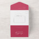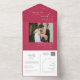Cette invitation tout-en-un présente une calligraphie élégante et une police de typographie simple avec une forme d'arc se dirigeant sur un viva magenta arrière - plan et photo et QR Code. La simplicité de ce design ajoute une touche d'élégance à votre mariage. Il fonctionne bien avec de nombreux thèmes mariages et certainement un grand ajout à votre mariage. Il suffit de customiser les noms et le libellé en quelques étapes simples et de personnaliser la carte d'invitation tout-en-un avec votre photo du couple heureux et de remplacer le code QR par le vôtre pour donner à votre invitation une touche personnelle agréable. Cette invitation vous fera économiser de l'argent pour envoyer tout en même temps. Il a une carte postale perforée RSVP peut être facile à déchirer et votre invité vous l'envoie. Il suffit de plier chaque carte dans la forme esquissée — sceller et envoyer à vos invités. Aucune enveloppe n'est nécessaire pour l'expédition — juste l'affranchissement. Remarque : Le libellé en forme d'arc de "Vous êtes invité au mariage de", "S'il vous plaît livrer à", "S'il vous plaît", ET "le mariage de" ET l'élégant script de typographie de calligraphie de "et", "Réception à suivre", "gentiment", "livrer à" ainsi que les lignes et autres éléments d'illustration graphique et les mots ne peuvent pas être modifiés, déplacés, et/ou supprimés. Elles sont réparées. Si vous devez changer la couleur, vous pouvez customiser l'invitation à la carte. Vous pouvez customiser et personnaliser l'invitation afin de répondre à vos besoins mariages et cliquez simplement sur personnaliser de l'invitation.