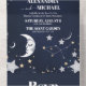 Cette faire-part de mariage tout-en-un résume magnifiquement l'élégance et la mystique d'une célébration à thème céleste, avec une lune de croissant sophistiquée comme élément central du design. La lune de croissant, ornée de détails complexes en feuille d'or, est dressée contre un arrière - plan marin ou bleu nuit, rappelant un ciel nocturne serein. Des étoiles dorées éparpillées apportent une touche de magie supplémentaire, créant une atmosphère romantique et rêveuse. L'invitation tout-en-un est conçue pour inclure tous les détails mariages essentiels dans un format homogène et pliable. Une fois ouverte, l'invitation dévoile les noms du couple clairement affichés dans un script élégant, avec les détails de la date et du lieu mariage soigneusement arrangés sous une police serif raffinée. Le luxueux texte en feuille d'or complète les éléments célestes, créant un look cohésif et poli. Cette invitation comprend également une carte postale RSVP détachable, intégrée dans la conception pour plus de commodité. La section RSVP est bordée avec goût de motifs d'étoiles subtils, permettant aux clients de remplir et de retourner facilement leurs réponses. Réalisée à partir de cartons lisses et haut de gamme, l'invitation tout-en-un a une allure luxueuse et est conçue pour faciliter l'utilisation. L'arrière de l'invitation peut comporter une suite du thème de nuit étoilé, avec des accents dorés délicats qui rehaussent le design général. Le format tout-en-un est non seulement pratique, mais il assure également que chaque élément de votre correspondance mariage est imprégné de charme céleste et d'élégance. Parfait pour les couples qui cherchent à simplifier leur papeterie mariage tout en conservant un thème cohésif et sophistiqué, cette invitation ouvre la voie à une célébration vraiment enchanteresse.