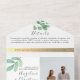 Elégant, moderne, simple or et blanc tout-en-un faire-part de mariage avec aquarelle feuilles eucalyptus, verdure et image du couple. Ajoutez votre photo, les détails du mariage et rsvp.
