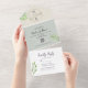 Élégant, botanique, moderne, simple sauge vert et or tout en un faire-part de mariage avec code QR, monogramme unique avec des oiseaux de couple d'amour dessinés à la main, script manuscrit tendance et image personnalisée de l'arrière. Ajoutez votre photo, les détails du mariage et rsvp.