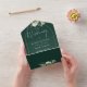 Le tout dans un faire-part de mariage vert émeraude avec des feuilles botaniques et rustiques tombant sur une arche d'or renfermant une élégante typographie. L'invitation comprend une carte RSVP perforée avec votre code QR du site Web mariage. Conçu par Thisisnotme©